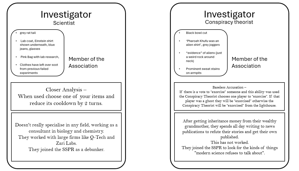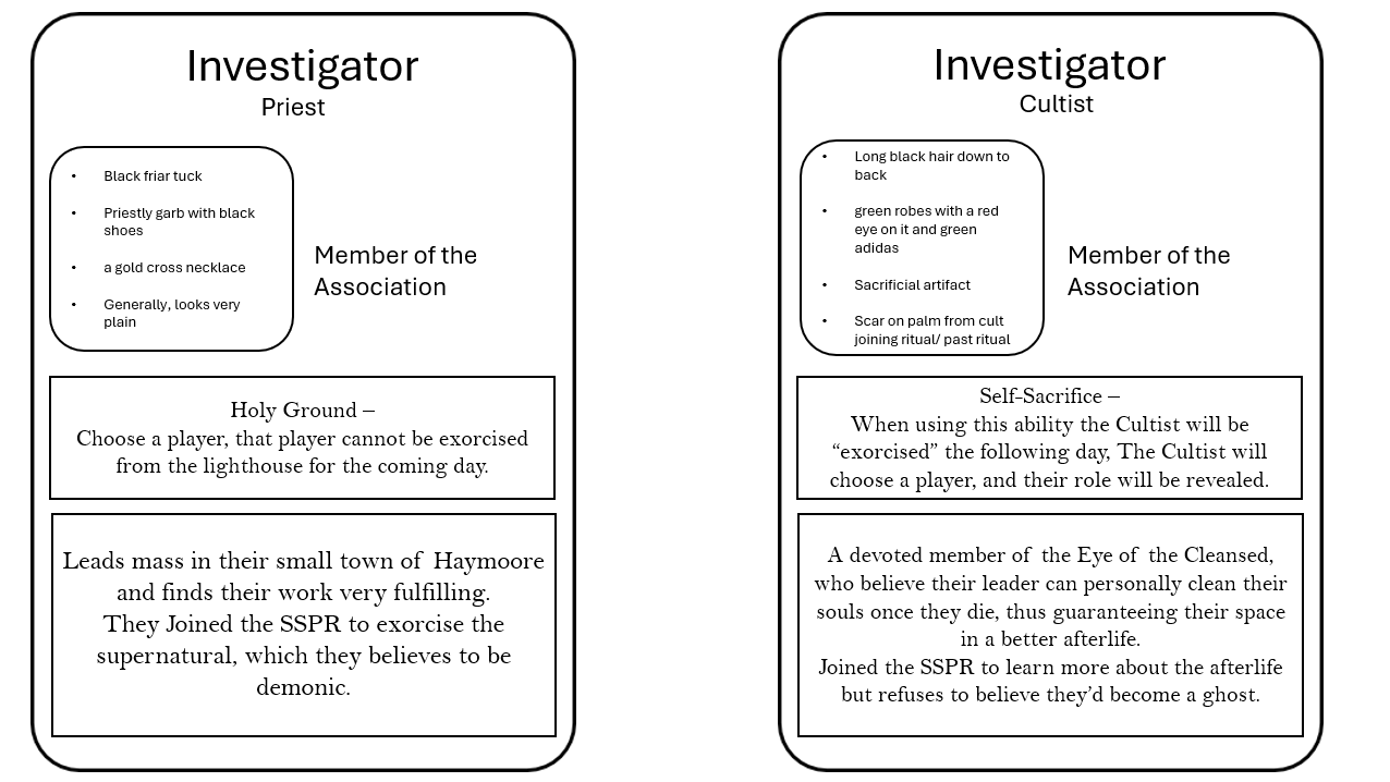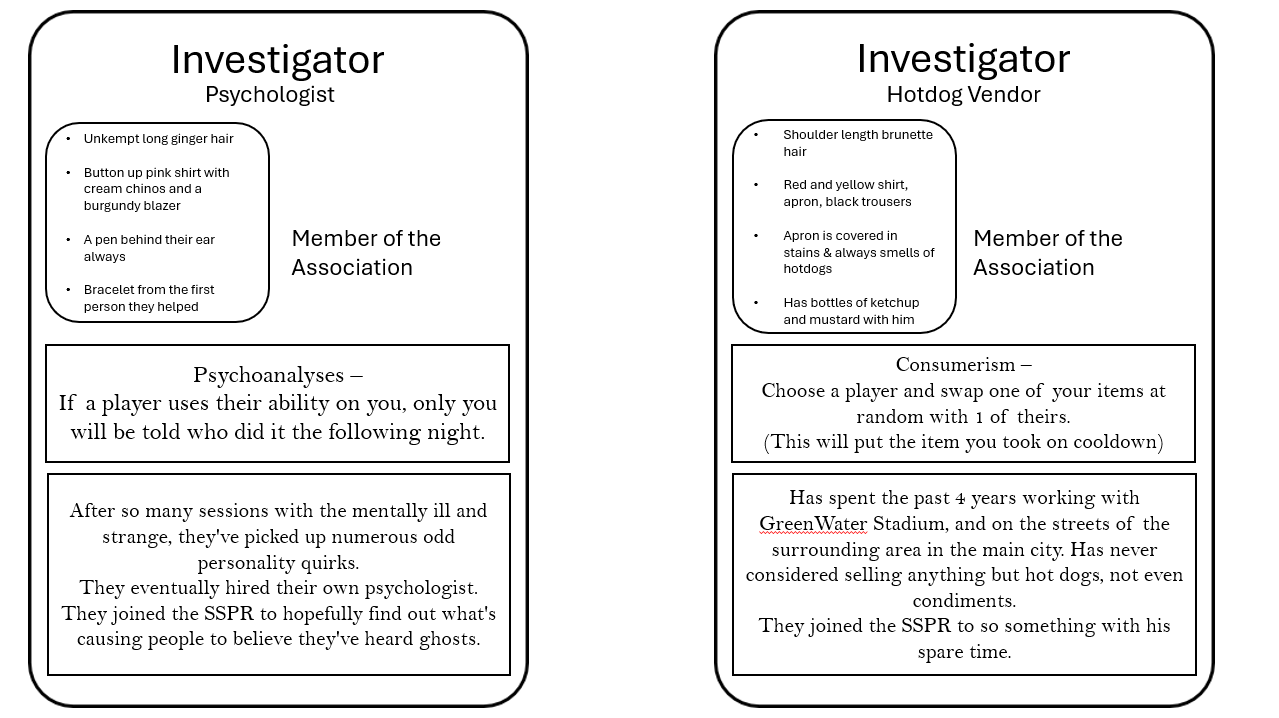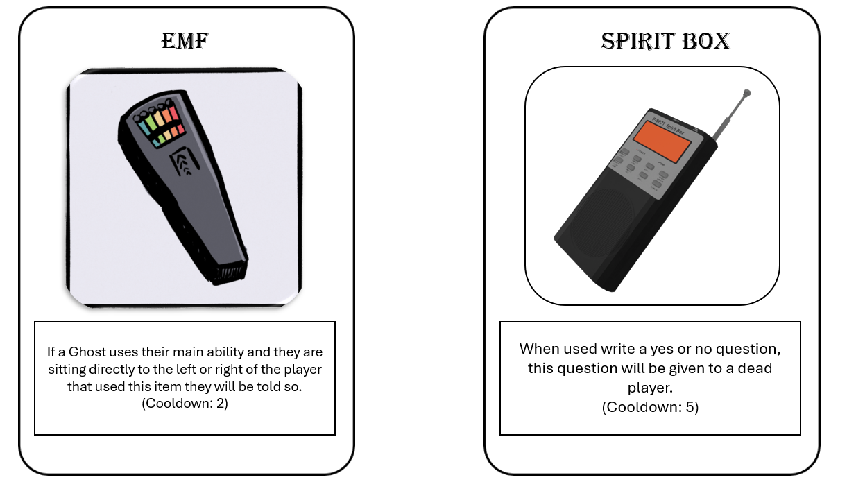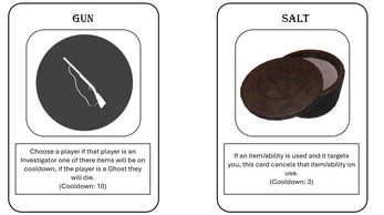 You play as either an Investigator or a Ghost (drawn at random from the narrator, who is another player) with unique abilities and items. Each day, players can discuss and interact with one another. During the night, players can use either an item or their unique ability. When the night is over, all the effects of the items and abilities happen, and the players can choose if they want to hold a vote to cast a player out of the game this day/night cycle, then repeat until the game is over.