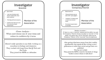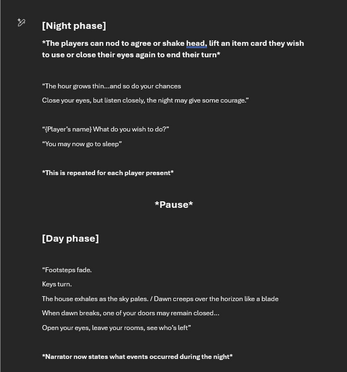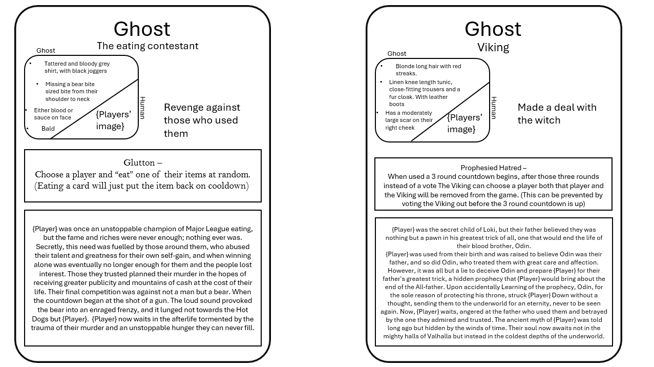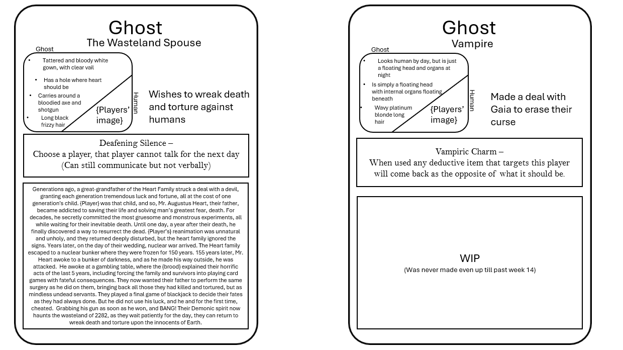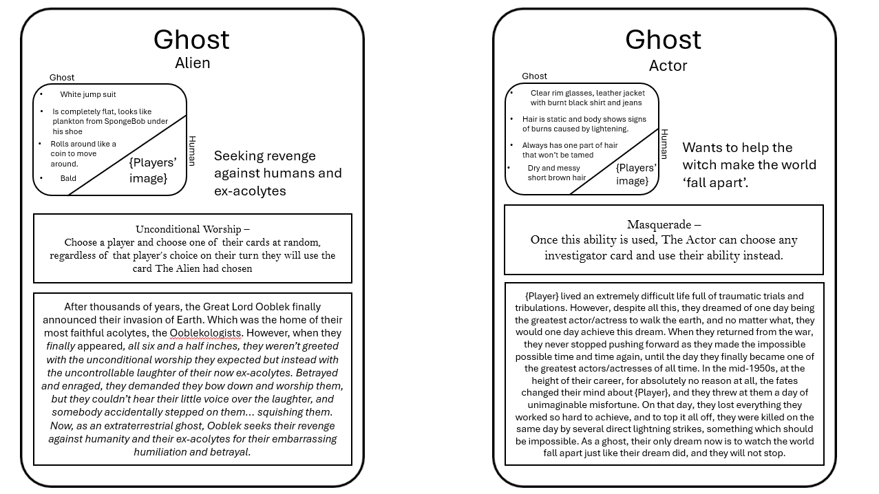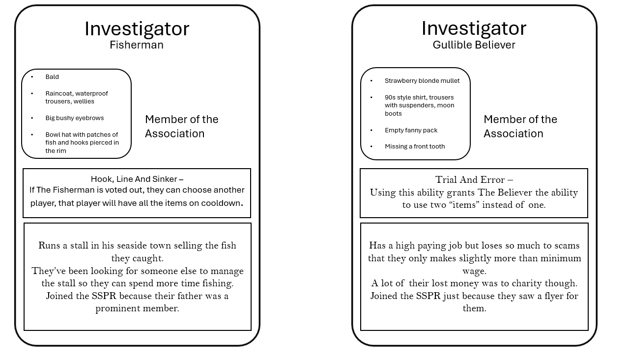You play as either an Investigator or a Ghost (drawn at random from the narrator, who is another player) with unique abilities and items. Each day, players can discuss and interact with one another. During the night, players can use either an item or their unique ability. When the night is over, all the effects of the items and abilities happen, and the players can choose if they want to hold a vote to cast a player out of the game this day/night cycle, then repeat until the game is over.