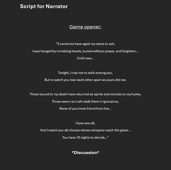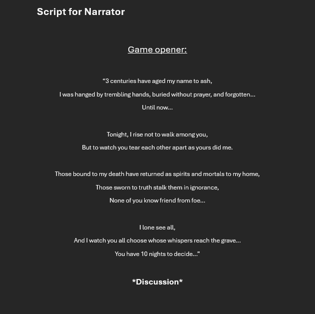 In 1692, Gaia was sentenced to be hanged due to her profession of speaking to the dead, by those who she deemed as friends . Over the span of over 300 years she's been plotting against the people whose ancestors caused her death as 'divine punishment'. She brought them all to her lighthouse, the same place she was trialled and hung, the place she had been bound to, but not for long. It is now a game of the living and the dead placed against each other, can a ghost fool the living and escape, unbinding the witch, or will the investigators snuff them all out. Only time will tell...